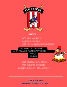 El passat dia 15 de juny el CP Caldes va organitzar un jornada de partits al polivalent com a cloenda de la temporada 2024-25. Partits: 10:00 Prebenjami C – Lloret B (lliga federada) 11:00 Prebenjami B – Ripoll B (lliga federada) 12:00 FEM 11 – CH Castellet (lliga federada) 13:30 DINAR (1/4 de pollastre/patates/pa/postres […]